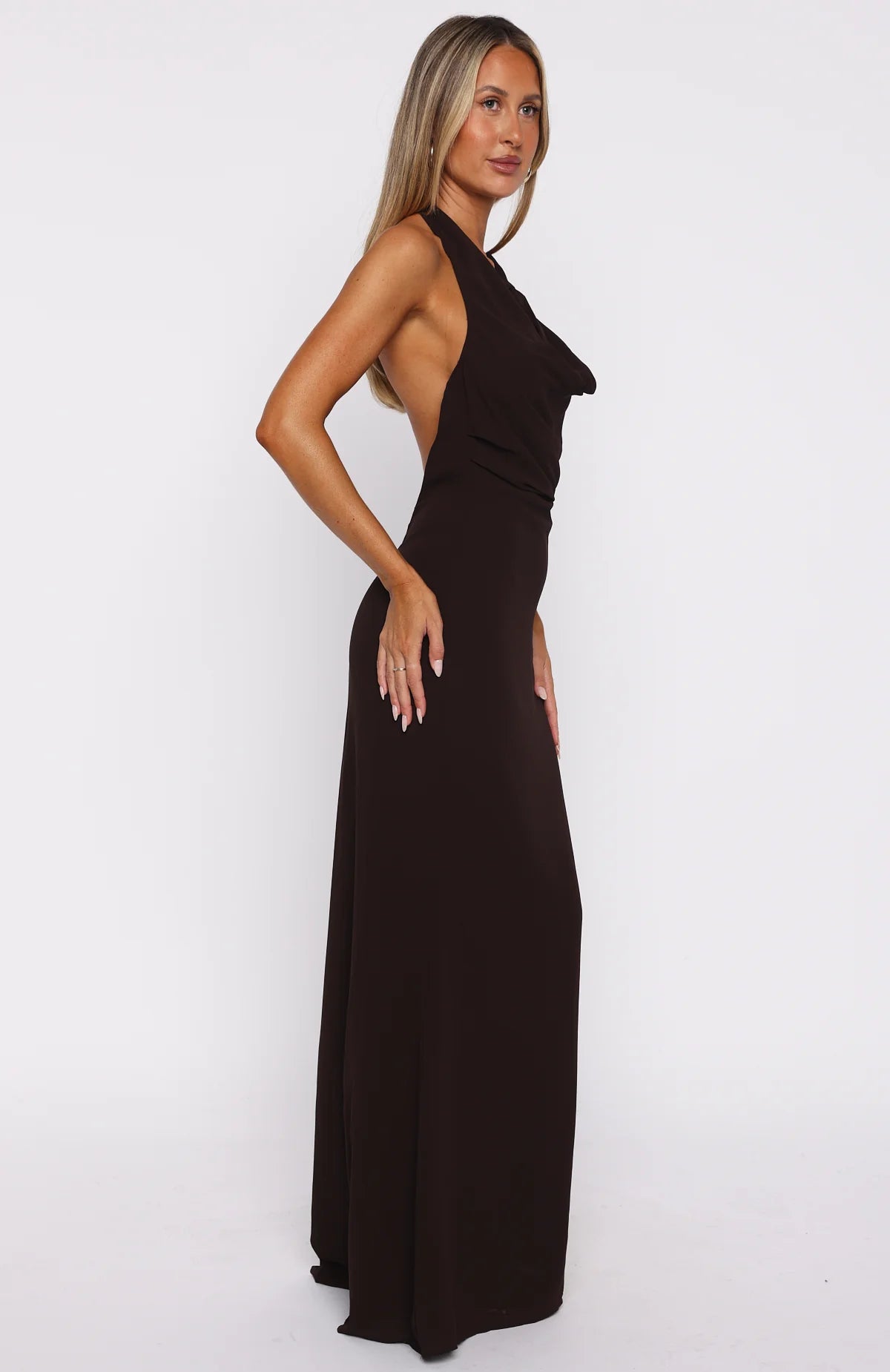 IT‑girl, meet your next obsession. The Always In Mode Halter Maxi Dress in Chocolate is designed with halter straps, draped cowl neckline, bust-enhancing ruching, and sleek lightweight silhouette. Fully lined and finished with a discreet side zipper and hook‑and‑eye closure. Slip on those heels and layer on the bling for a look that’s pure magic.