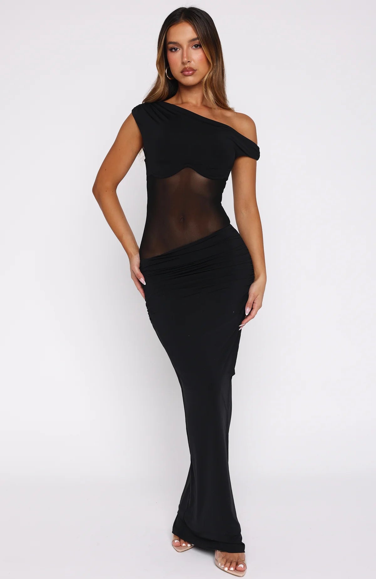 Fun and flirty vibes only! Our Pushing Limits Maxi Dress in Black features a one-shoulder neckline and sheer bodice, with the underwire bust adding support. The sleek silhouette is enhanced with ruched detailing along the side of the skirt, framing your curves. The fabric is lined for comfort yet offers high stretch for ease of movement. Pair with kitten heels and simple gold jewellery to let the dress do all the talking!