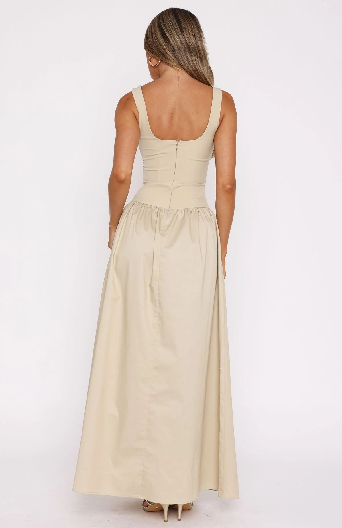 Add a touch of wow to your summer wardrobe with the Summer Delight Maxi Dress in Stone. Featuring thick shoulder straps, square neckline invisible back zipper and clasp closure, fitted bodice and lined, gathered skirt with side pocket design.