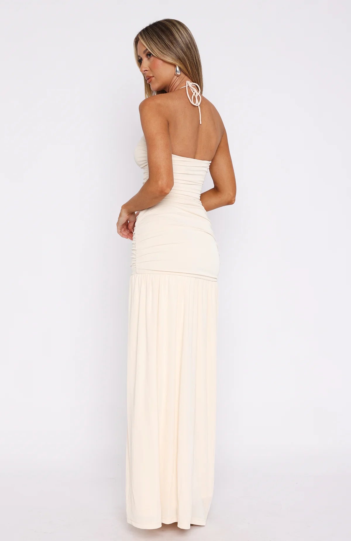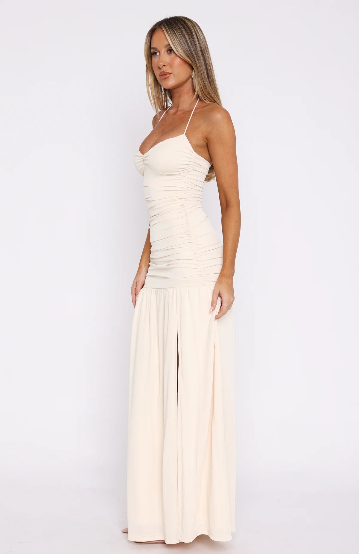 A vacay dream! The Sweet Skies Maxi Dress Cream features a halter style neckline with thin self-tie straps, low cut neckline, front ruched bust detail and dress bodice, hugging silhouette, maxi drop skirt with high cut split hem design, lined fabric, and stretch for a slip on design. Pair with kitten heels and simple accessories to let the dress do all the talking.