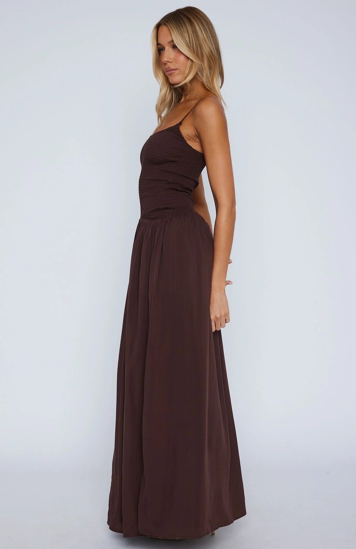 Elevate your weekend wardrobe with the Too Many Questions Maxi Dress Chocolate! Features thin straps, square neckline, shirred bodice design with high stretch, full length and lined. Complete the with clear heels and gold jewellery for a look we are loving!
